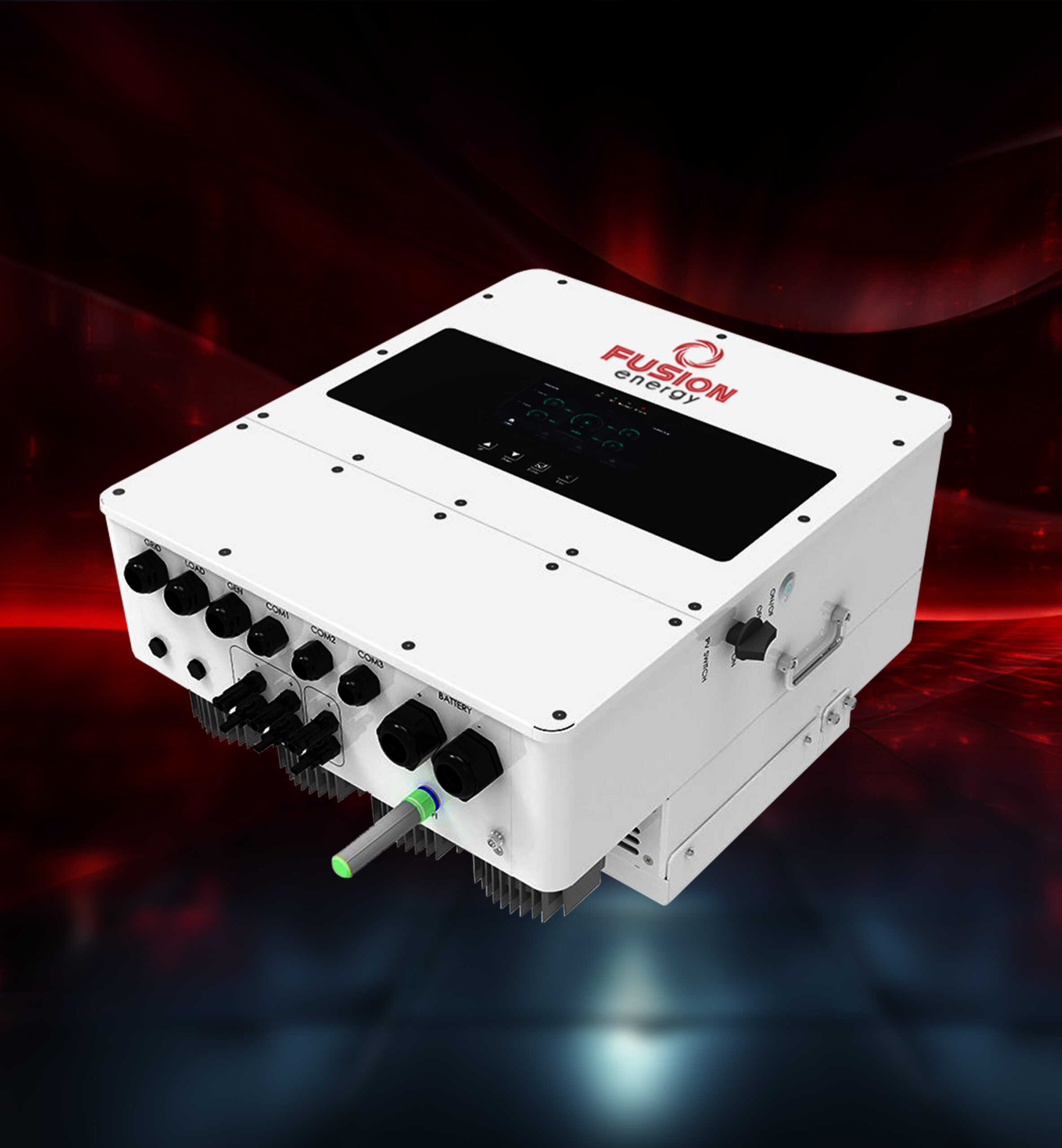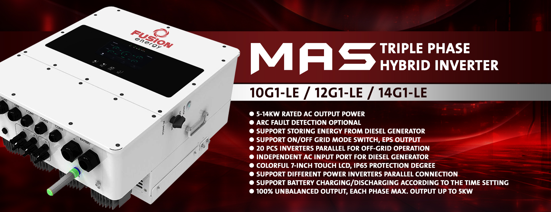 Fusion Mas single/three-phase hybrid inverter, featuring a colorful touch LCD, supports up to 20 inverters connected in parallel for both on-grid and off-grid operations. Its automatic ON/OFF GRID switching and programmable battery charge/discharge scheduling enhance operational flexibility. It also supports triple-phase mode, full-power single-phase output, and energy storage from diesel generators.
